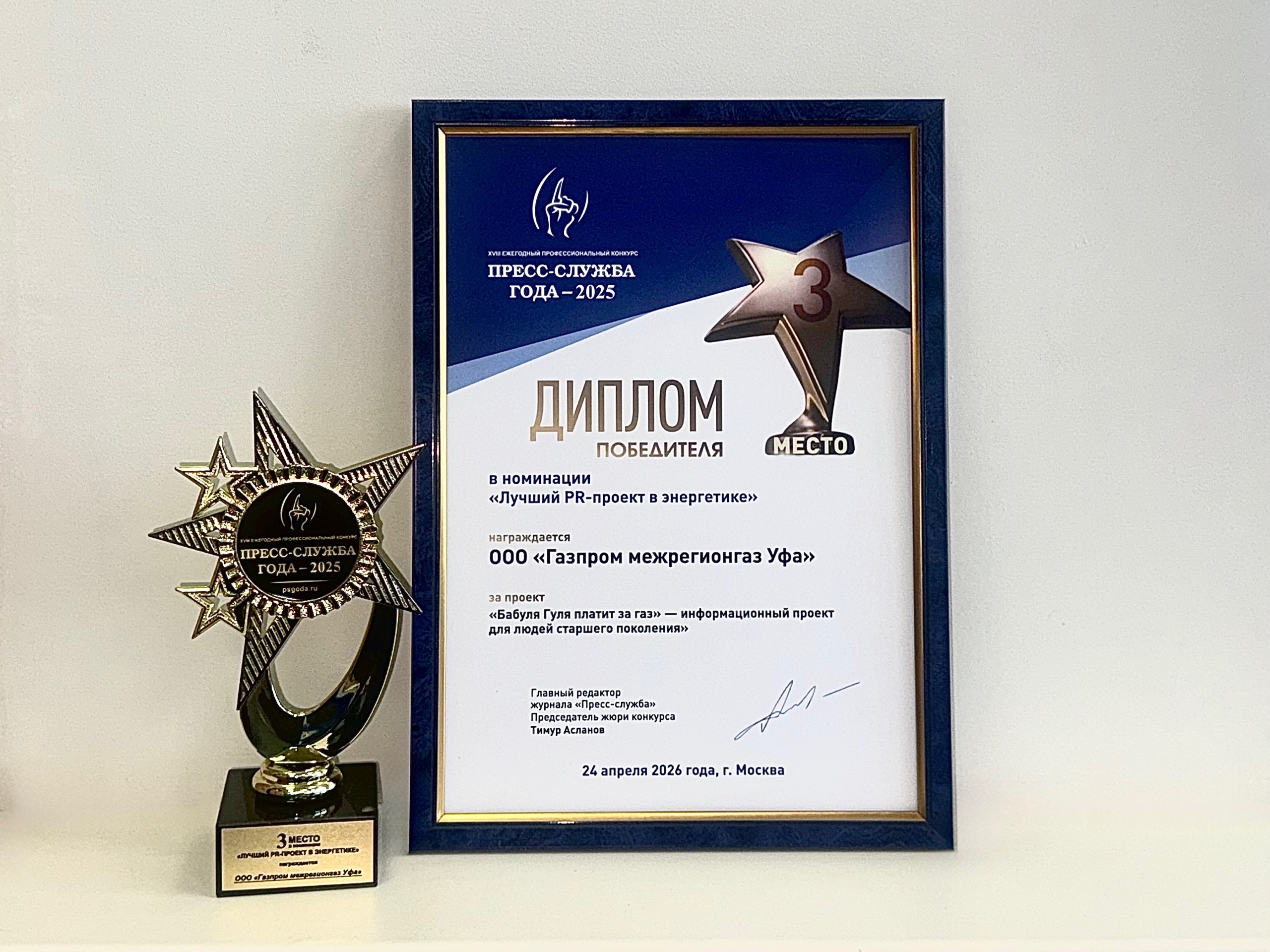 Компания «Газпром межрегионгаз Уфа» стала призёром Всероссийского профессионального конкурса «Пресс-служба года — 2025». Информационный проект для людей старшего поколения «Бабуля Гуля платит за газ» занял третье место в номинации «Лучший PR-проект в энергетике».